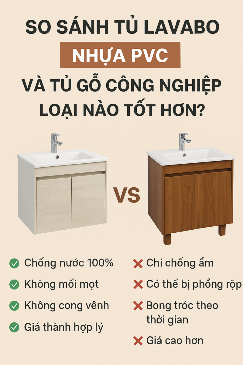 Trong xu hướng thiết kế nội thất phòng tắm hiện đại, tủ lavabo luôn là hạng mục quan trọng giúp tối ưu không gian và tăng tính thẩm mỹ. Trên thị trường hiện nay, hai chất liệu phổ biến nhất là nhựa PVC và gỗ công nghiệp. Mỗi loại đều sở hữu ưu điểm riêng, khiến nhiều người phân vân không biết nên chọn loại nào để đảm bảo bền – đẹp – phù hợp với điều kiện sử dụng lâu dài.