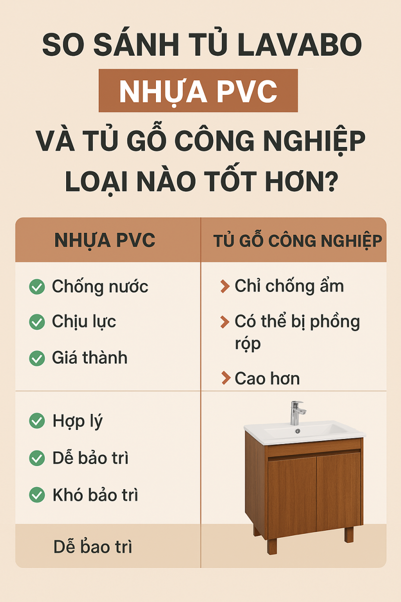 Bài viết dưới đây sẽ phân tích toàn diện, so sánh chi tiết giữa tủ lavabo nhựa PVC và tủ lavabo gỗ công nghiệp, giúp bạn có cái nhìn rõ ràng hơn trước khi đưa ra quyết định chọn mua.